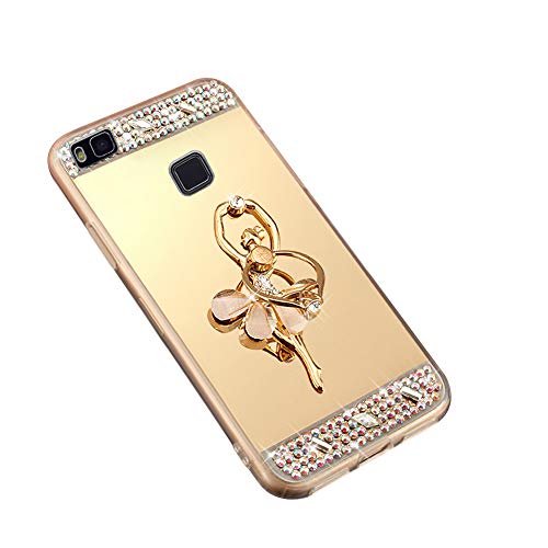 Surakey Cover Huawei P9 Lite, Specchio Silicone Morbido Cover con Anello Supporto Bling Strass Glitter Diamante Lusso Mirror Hard Case Ultra Sottile Custodia per Huawei P9 Lite,Ragazza Oro