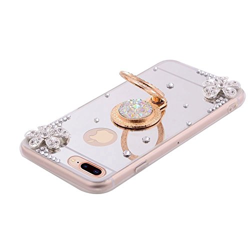 Surakey Cover iPhone 7 Plus/8 Plus,Effetto Specchio Silicone Cover con Fiore Brillante Strass Bling Rotazione Grip Ring Supporto Case Ultra Sottile Protettiva Custodia per iPhone 7 Plus/8 Plus,Argento