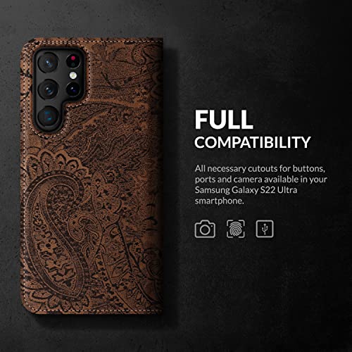 SURAZO Custodia magnetica per Samsung Galaxy S22 Ultra 5G (6,8"), in vera pelle, con scomparto per carte di credito, protezione RFID, motivo floreale, realizzata a mano in UE (marrone)