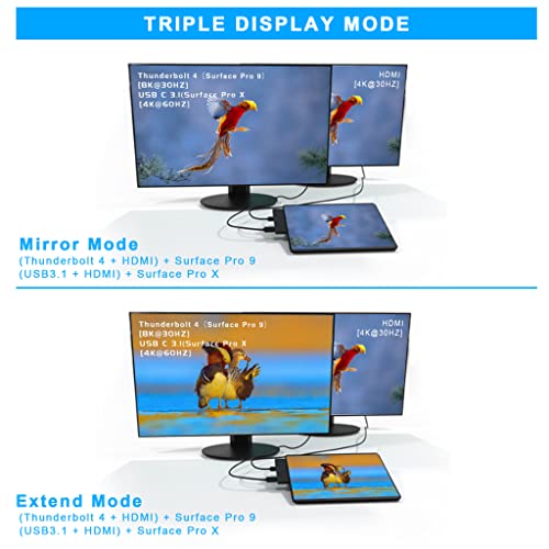 【Display triplo in modalità Mirror ed Extend】La docking station Surface Pro 9/X può aiutarti a specchiare o estendere 3 schermi. (Surface Pro 9/X + USB-C Thunderbolt 4/USB C 3.1 + 4K HDMI) Il display a 3 schermi aumenta la produttività di 3 volte, puoi realizzare progetti diversi su monitor diversi. Un gadget ideale per editor video, fot