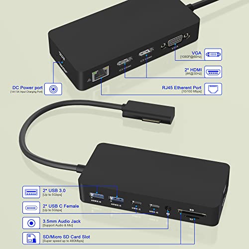 【Stazione di connessione Surface 12 in 1】la docking station di Surface utilizza la tecnologia di connessione che può essere ricaricata tramite un cavo e la trasmissione ad alta velocità di video, audio e dati mantengono il vostro desktop in ordine. Il Surface Dock è dotato di 2 porte HDMI 4K @ 30 Hz, 1080P @ 60 Hz, connettore VGA 100 Mbps Gigabit RJ45, 2 porte USB C, 2 porte USB 3.0, slot per schede SD/TF, jack per cuffie da 3,5 mm.