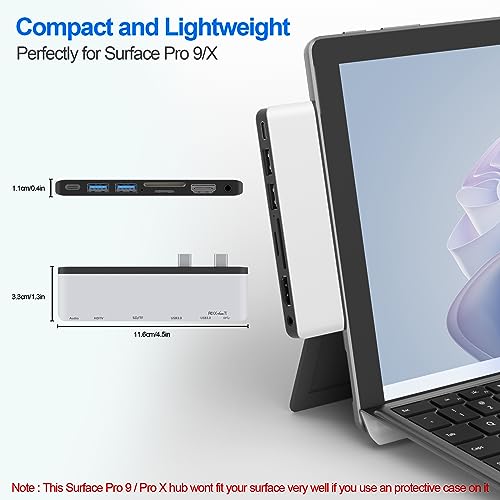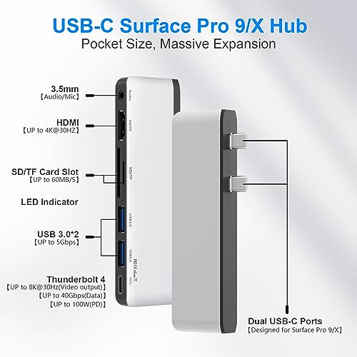Progettato per il Surface Pro 9: progettato specificamente per il Microsoft Surface Pro 9, trasforma le 2 porte USB-C in 7 porte: Porte USB 3.0*2, porta HDMI 4K@30Hz*1, porta USB-C (visualizzazione video 8K@30Hz + trasferimento dati 40Gbps + ricarica 100W)*1, slot per schede SD*1, slot per schede TF (Micro SD)*1, audio da 3,5 mm*1. Semplicemente plug and play, non è necessario alcun driver. Compatibile solo con Microsoft Surface Pro 9/Pro X.
