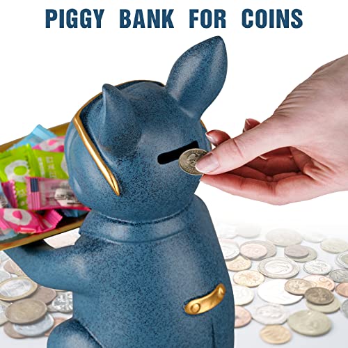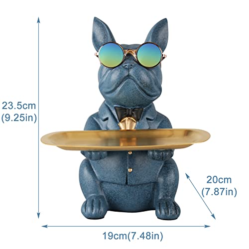Suruim Statuetta e salvadanaio a forma di bulldog, con vassoio, in resina, scultura a forma di animale, decorazione da tavolo, multifunzione, decorazione per casa e ufficio (blu)