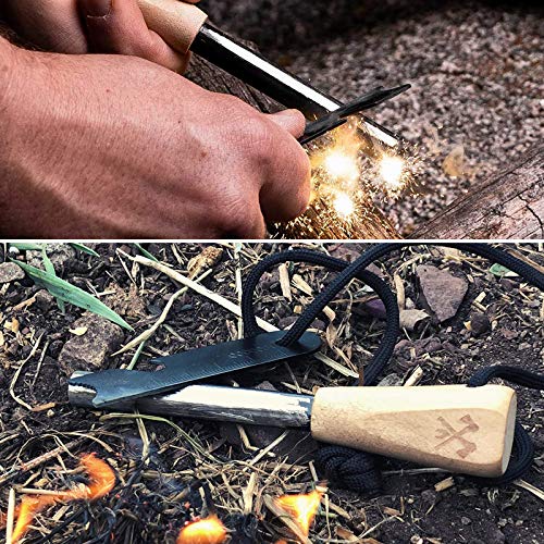 Survival Flint And Steel Fire Starter Kit, con Manico in Legno Artigianale, Bacchette in Acciaio con percussore Multiuso e Cordino da Collo-Polso per l'attrezzatura da Campeggio