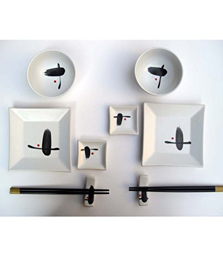 Set Sushi in Ceramica Per 2 Persone Dipinto Maneki Neko - Set Compreso 2 Piatti Per Sushi, 2 Piattini Per Salsa Di Soia, 2 Appoggio Bacchette E 2 Paia Bacchette in Legno Set 10 Pezzi