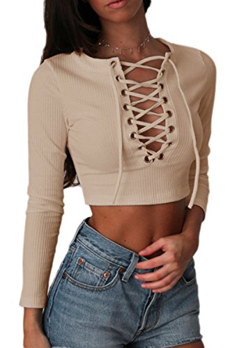 Suvotimo Le Donne Si Allaccia Al Collo Lo Scollo A V A Maniche Lunghe Per T - Shirt Maglietta Attillata. Khaki S