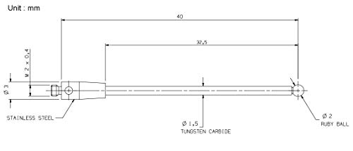 Sfera da rubino da 2 mm, fusto in metallo duro, filettatura M2, lunghezza 40 mm.