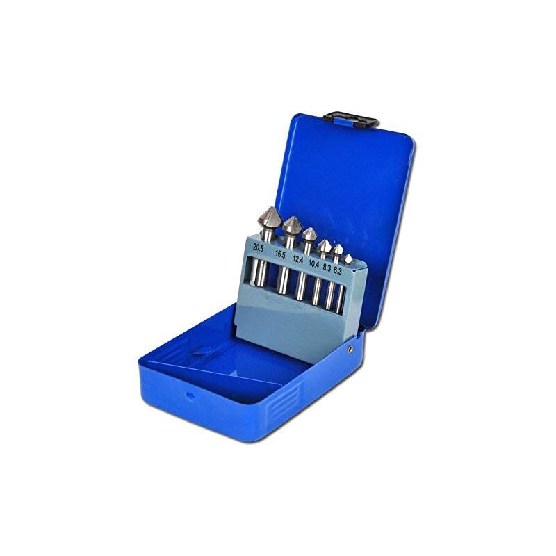 Descrizione Set di 6 svasatori conici (6,3 / 8,3 / 10,4 / 12,4 / 16,5 / 20,5 mm) Materiale: HSS-M2. Norma: DIN 335 C (codolo cilindrico). 3 taglienti: 90 taglio destro Con scatola di metallo