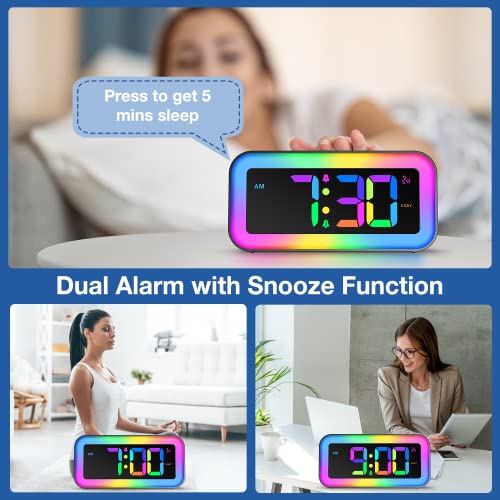 Sveglia Digitale per Camera da Letto, con 7 Luci Notturne Colorate, Snooze, Attenuazione 10%-100%, Suono di Allarme Forte 120dB, Controllo Vocale, 2 Modalità Sveglia, Ricarica USB, Schermo LED HD