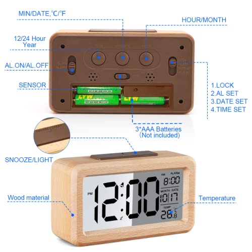 Sveglia digitale da comodino a LED, sveglia in legno con controllo della luce, sensore intelligente, data, temperatura, 12/24 ore, orologio da tavolo