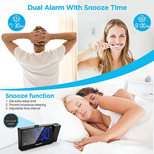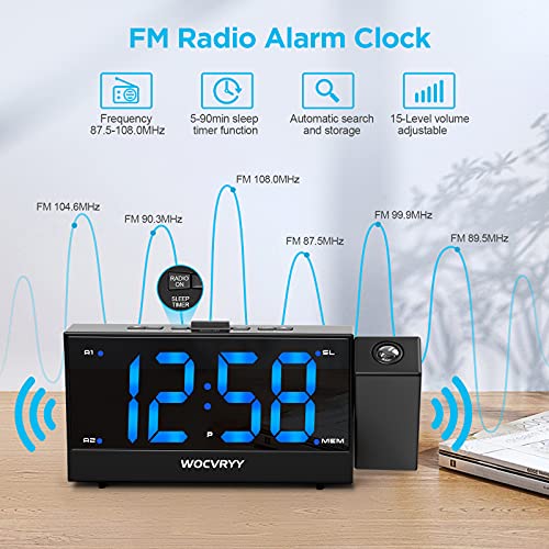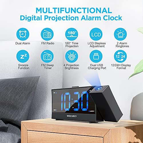Sveglia Digitale da Comodino con Proiettore, WOCVRYY Radiosveglia con Proiettore, Proiezione Ruotabile di 180 Gradi, Doppia Sveglia Snooze FM Radio 2 Porte di Ricarica USB