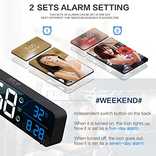Doppio allarme con funzione snooze: puoi impostare 2 allarmi indipendenti in un giorno per pianificare il tuo tempo. Utilizza la funzione snooze, tocca la parte superiore per dormire quando suona l'allarme, il tempo di snooze è di 5 minuti, 4 livelli di volume regolabili e ci sono 40 diverse direzioni musicali tra cui scegliere. Tasto del giorno della settimana attivato, sveglia spenta, non disturba il fine settimana, dormi fino a quando non ti sveglii naturalmente.