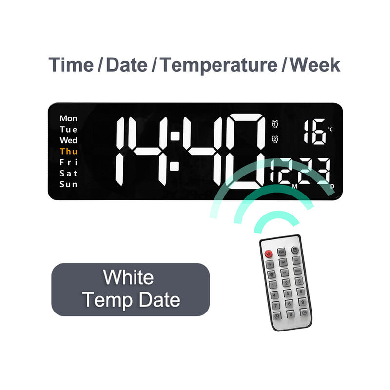 Specifica Nome: grande orologio da parete digitaleMateriale: ABS + acrilicoFormato: 38.7*3.2*13cm/15.24x1.26x5.12inchMetodo di ricarica: spina diretta USB (batteria a pulsante integrata, batteria a pulsante integrata con telecomando)Cavo di ricarica USB: 350cm Nota: solo plug-in da usare! La batteria a bottone viene utilizzata solo per ricordare l'ora e l'orologio deve essere collegato in tutto il tempo. Caratteristiche ✨Grande orologio da parete semplice a LED, funzione unica avanti/conto alla rovescia, può visualizzare ora/data/temperatura/settimana contemporaneamente✨Dotato di un telecomando, che può controllare a distanza l'orologio elettronico a LED. Design bicolore, separare diverse aree, più intuitivo per vedere l'ora✨Dieci livelli di regolazione della luminosità, interfaccia USB. Design unico dell'avvolgimento sul retro, evita le interferenze del filo, più bello, mantieni la tua casa in ordine✨Funzione di memoria di spegnimento, ampio display con numeri arabi, facile da