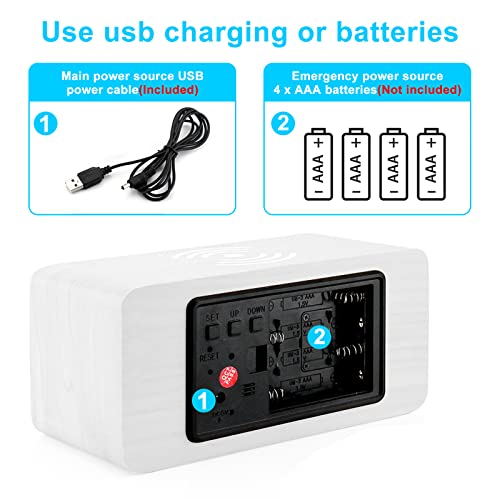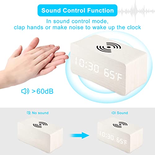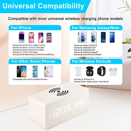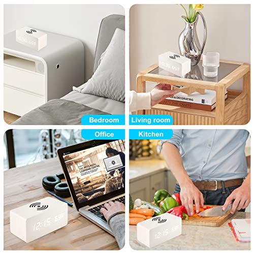 Sveglia digitale in legno, orologio digitale da comodino con ricarica wireless, visualizzazione della temperatura, sveglia snooze dimmerabile per soggiorno, camera da letto e ufficio (bianco)
