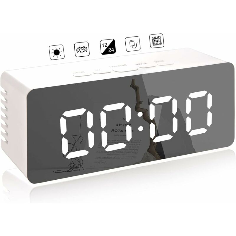 Ampio display a LED: la nostra sveglia ha un ampio display a specchio a LED da 5,6 pollici, con grandi cifre LED blu, facile da leggere giorno e notte e 2 livelli di luminosità regolabili possono essere facilmente regolati in base alle tue preferenze personali. Con 12/24 ore commutabili, sveglia, funzione snooze e visualizzazione della temperatura. 12/24 ore e temperatura: le informazioni sullo schermo includono mese, data, impostazione della sveglia e temperatura interna. La visualizzazione dell'ora supporta i formati 12 ore e 24 ore e l'unità °F/°C è commutabile. Funzione snooze e funzione di memoria: basta premere il pulsante SNZ per impostare 5 minuti di snooze. Ha una funzione di memoria (richiede 3 batterie AAA) per ricordare le tue impostazioni, assicurati di non dover ripristinare dopo un'interruzione di corrente. Comodo allarme sveglia: l'allarme soft wakeup inizia dolcemente e gradualmente diventa più forte fino a quando non lo spegni. Non devi scegliere tra una sveglia dura