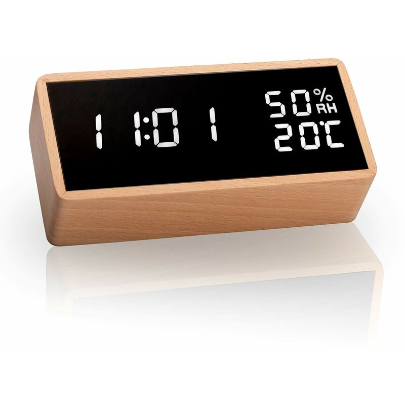 Custodia in puro legno: la sveglia digitale viene fornita in una custodia in puro legno ed è esteticamente gradevole. L'orologio da tavolo perfetto per uffici, soggiorni e camere da letto. Nessun disturbo: la sveglia da viaggio ha 3 livelli di luminosità con una qualità di illuminazione di prima classe. Puoi scegliere la luminosità più comoda per i tuoi occhi. La sveglia digitale ha una funzione di controllo della musica. Ogni pressione e suono oltre i 60 dB nelle vicinanze attiva la sveglia a LED. Lo schermo si spegnerà automaticamente dopo 30 secondi, il che non ti disturberà quando dormi la notte. Alimentazione: La sveglia è alimentata tramite caricatore USB (l'adattatore non è incluso). Lo schermo a LED è relativamente ad alta intensità energetica. Per utilizzare la sveglia in modo stabile, si sconsiglia l'uso della batteria. Il prodotto non dispone di un vano batteria. Tutti gli adattatori 5V/1A o superiori funzionano con la sveglia digitale. Monitora temperatura e umidità