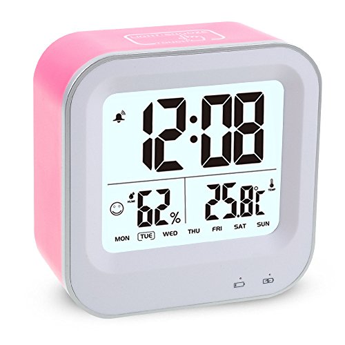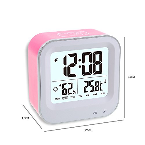 Sveglia digitale ricaricabile da comodino per bambini, orologio intelligente, orologio + sveglia + temperatura + umidità + data + modalità snooze + retroilluminazione, multifunzionale e portatile, 10 x 10 x 4.6cm, (Rosa-1)