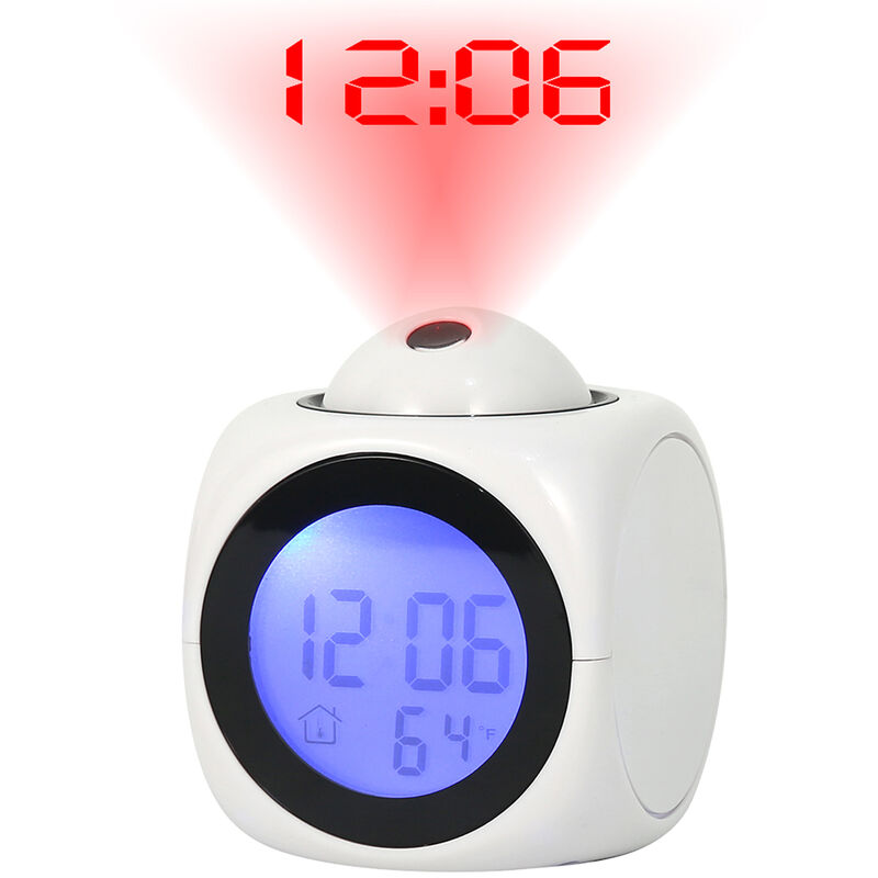 Funzione di proiezione - dopo aver pressato la cupola, la proiezione rimane per 5-10 secondi. Puoi anche aprire gli occhi per leggere l'ora della mattina, l'angolo di proiezione è regolabile di 90 gradi. Per evitare il surriscaldamento della proiezione continua, regola accuratamente il tempo di proiezione. [Ampio Display LCD] una volta messo nella batteria o collegare il cavo USB, l'ora, la temperatura, l'allarme (se lo hai impostato) sarà visibile sul display così sei pronto per iniziare la tua giornata. Si prega di strappare la pellicola protettiva del display a LED prima dell'uso. [Five Beautiful melodie] la sveglia contiene cinque toni diversi, che puoi scegliere in base alla tua preferenza per iniziare la giornata in modo fluido e felice. Questa sveglia funziona su 3 batterie AAA (non incluse). [Modalità Snooze] con questo orologio al mattino, puoi snooze per 10 minuti per un tempo di riposo extra, ma assicurati di andare dove hai bisogno di essere in tempo. Il tempo può essere
