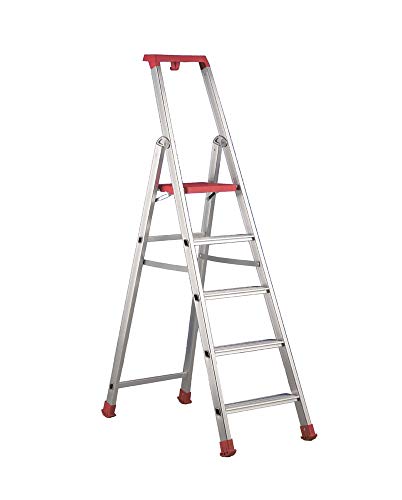 Svelt Scala Alluminio 5 gradini con Parapetto, Maniglione Porta Attrezzi, Ampia Piattaforma Zigrinata ed Evoluto Sistema di Ribordatura Automatica