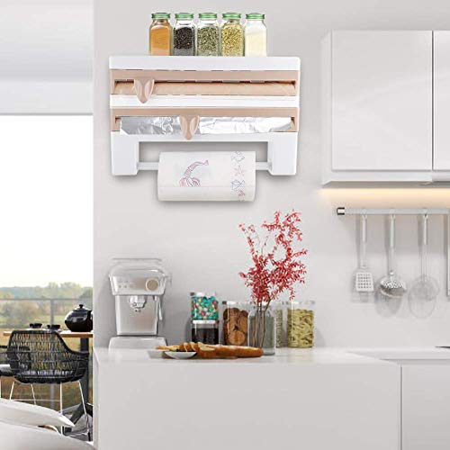 Ampia gamma di usi: Porta salviette di carta multifunzionale a parete con involucro di plastica, ripiano portaoggetti e taglierina per pellicola, grande funzionalità, è un perfetto aiutante e strumento da cucina.