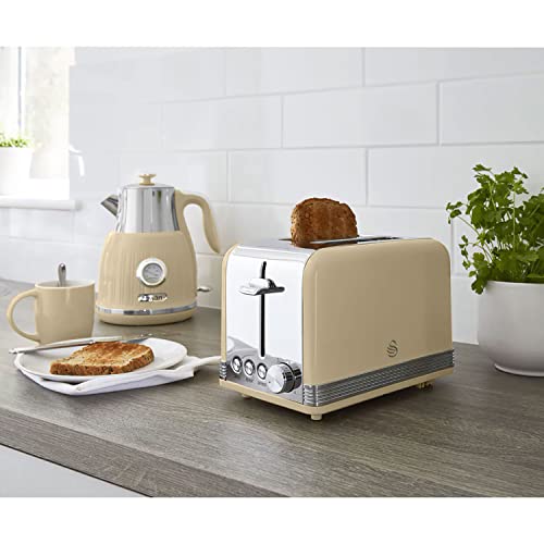 Swan Retro ST19010CNEU Tostapane a Fessura Larga 2 Fette, Design Vintage, 3 Funzioni: Scongelamento, Riscaldamento, Annullamento, 6 Regolatore del livello di Tostatura, Acciaio Inox., Crema, 815W