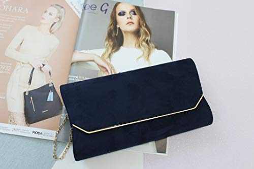 Stile: Pochette Flapover, Chiusura: Bottone a scatto, Materiale: finta pelle scamosciata, Cinturino a catena abbinato incluso