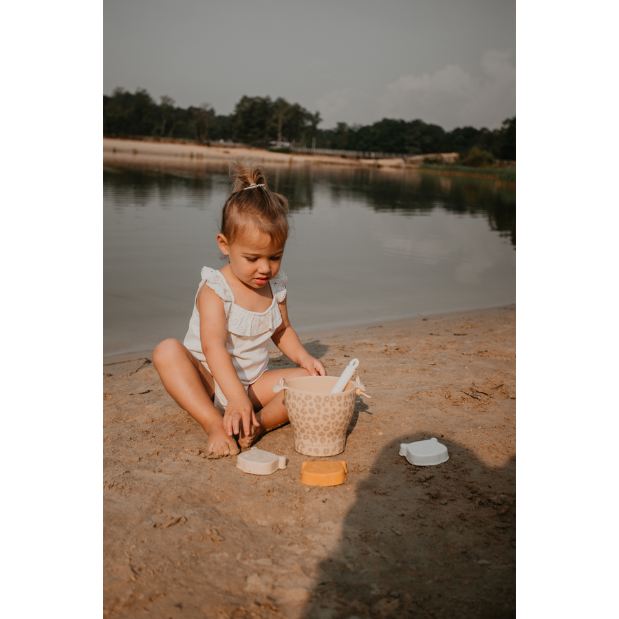 Dettagli del prodotto: Set da spiaggia in silicone leopardato con secchiello, paletta e 3 formine Dimensioni e peso: Dimensioni assemblate (lunghezza x larghezza x altezza): 15 x 15 x 22,5 cm Peso: 0,5 kg Materiale e cura: Materiale: 100% PVC 6P durevole 18PAHS Cura: pulire con un panno umido