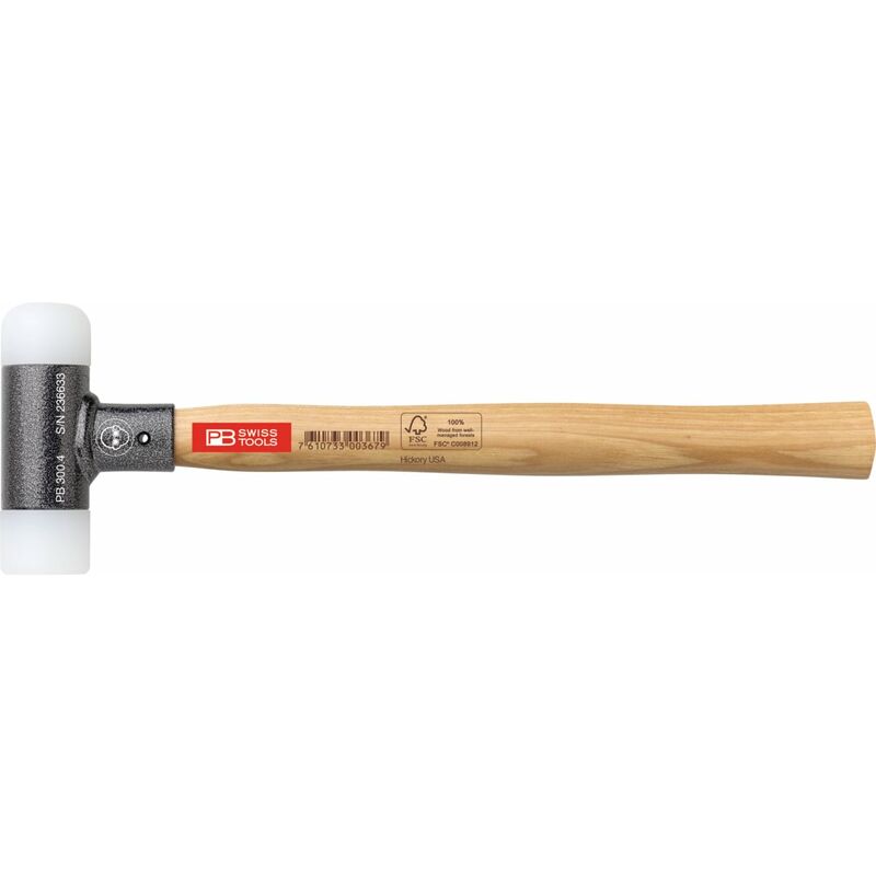 Robusta parte centrale in acciaio con perno di supporto e sede per tasselli. Tasselli in nylon resistenti all'usura (medio-duri). Con manico in noce americano. Antirimbalzo grazie ai pesi presenti nel corpo del martello. Al momento dell'impatto i pesi vengono spinti verso il basso e assorbono il contraccolpo. Uso: Per la spianatura o l'applicazione di pezzi sui banchi macchina e per colpi morbidi nei lavori di montaggio. Ricambi: Per bussole di ricambio vedi n. art. 754720 e 754730. Manico di ricambio in noce americano: vedi n. art. 754840. Dati tecnici Antirimbalzo sì Tipo di prodotto Martello Lunghezza manico, mm 285 Materiale manico Manico in noce americano Materiale corpo Acciaio Lunghezza complessiva, mm 320 Materiale inserto Nylon bianco ⌀ Testa della mazza, mm 32 Lunghezza testa con tasselli, mm 100 Peso, kg 0,391
