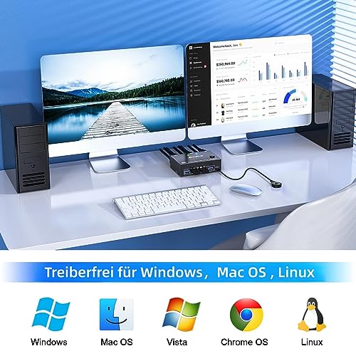Eccellente compatibilità e 2 modalità di commutazione: MLEEDA monitor switch 2 PC 2 monitor senza driver per Windows e Mac OS. Alimentazione tramite cavo USB, ma quando si utilizza un dispositivo USB ad alte prestazioni (ad es. ad esempio disco rigido, SSD ecc.), è necessario un adattatore esterno da 5 V. È possibile commutare 2 PC con il pulsante o il telecomando via cavo (incluso). Due LED colorati indicano il PC attivo.