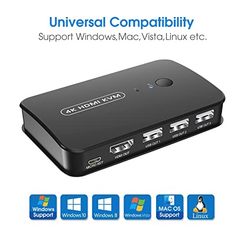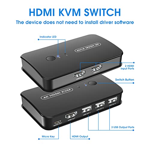 Switch KVM HDMI 4K per 2 PC, 4K@30Hz, 3 USB 2.0, Switch KVM USB Condividi Monitor Mouse Tastiera Stampante Scanner Periferiche USB, con Cavo KVM HDMI