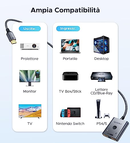 Switch HDMI 4K@60Hz, WARRKY [Alluminio, Cavo Fisso in Nylon 1m] Sdoppiatore HDMI Bidirezionale 2 in 1 out (Uno Schermo alla Volta), Splitter HDMI Supporto HDR/HDCP 2.2/3D 1080p Per TV, PC, PS5, Xbox