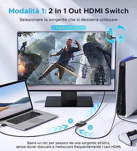 【4K@60Hz Switch HDMI Bidirezionale】 Questo Sdoppiatore HDMI può collegare 2 sorgenti HDMI (TV, PS5, XBOX) a 1 monitor HDMI o commutare 1 sorgente HDMI tra 2 monitor. (*Nota: solo uno dei due schermi può visualizzare un'immagine). Plug and play, non richiede l'installazione di driver o l'alimentazione esterna.
