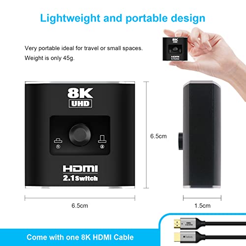 【Interruttore 8K HDMI 2.1 2 In 1 Out】 Lo switch premium in lega di alluminio 8K 2x1 HDMI 2.1 può trasmettere facilmente video e audio da 2 diverse sorgenti HDMI a 1 display HDMI, NESSUN flash o calo nella risoluzione 8K UHD. Liberati dal collegare e scollegare i cavi HDMI, goditi facilmente il tempo di lavoro e il tempo di riproduzione passando da 2 dispositivi con un solo pulsante. È molto più semplice premere un pulsante piuttosto che scollegare e collegare ogni volta un cavo HDMI diverso.