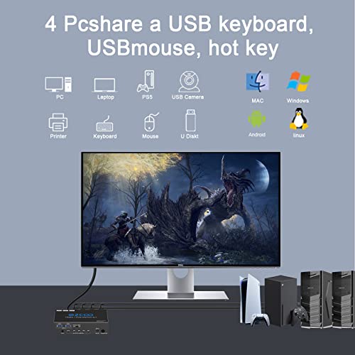 4 porte: consente di controllare 4 computer con un set di controlli (mouse e tastiera) e schermo di visualizzazione. Alta compatibilità, funziona alla grande per controllare rapidamente PC, console di gioco e sistemi di sicurezza su diversi sistemi operativi come Windows, Linux MAC, buona esperienza.