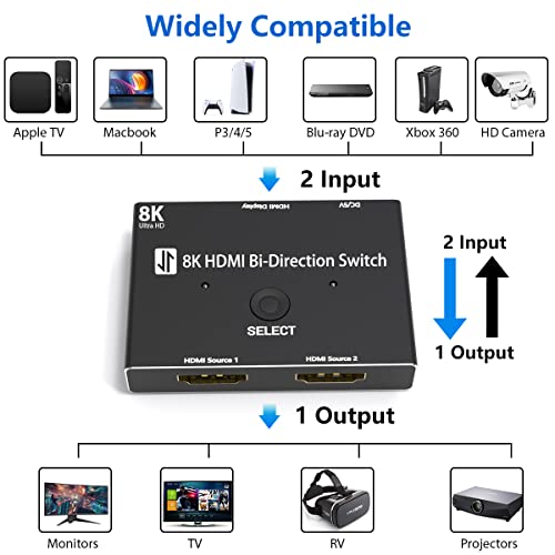 Switch HDMI 8K: lo switch HDMI 8K, basta premere il pulsante "Select" per passare da due dispositivi sorgente HDMI, passare da intrattenimento all'ufficio, il che è conveniente per il tuo lavoro e la tua vita. Per un display stabile, provare ad alimentare lo switch.