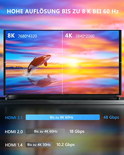 [ Ultima risoluzione 8K ] Supporta la più recente risoluzione 8k@60Hz, 4k@120hz, 1080p @240Hz ed è compatibile in avanti. HDMI 2.1 supporta VRR e Dynamic HDR Chroma 4:2:0 / 4:2:2 / 4:4, Dolby Vision/Atoms e HDCP 2.3;