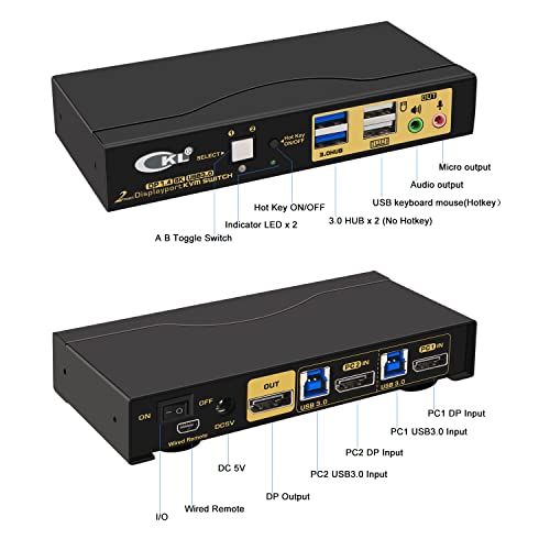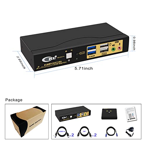 CKL Switch KVM USB 3.0 a 2 porte DisplayPort 1.4 8K@30Hz per 2 computer, 1 monitor, tastiera schermo PC, mouse periferica audio condivisione selettore con tutti i cavi (62DP-4)