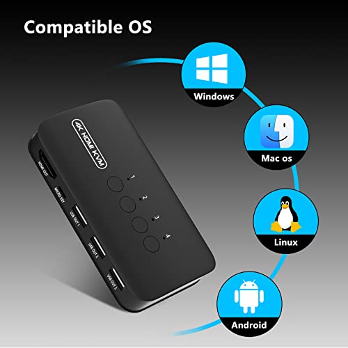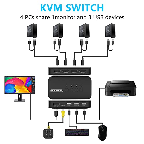 Uscita 4 in 1: HDMI KVM commutata per controllare i tuoi 4 computer tramite un controller desktop o 4 tasti dallo switch KVM. Attraverso questo prodotto, con un hub USB a 3 porte nella parte anteriore, 4 host di computer o altre sorgenti di segnale possono condividere 1 set di monitor, stampante, tastiera, mouse o disco U, ecc.
