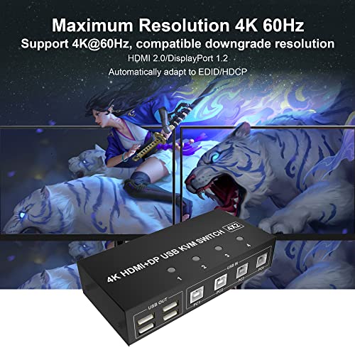 Switch KVM a 4 porte HDMI + Displayport Dual Monitor 4 computer 4K a 60Hz Supporto HDMI2.0 DP1.2 KVM Switch con 4 USB Hub, Tastiera Mouse Monitor Switcher per 4 PC Dual Monitor (HDMI+Displayport)