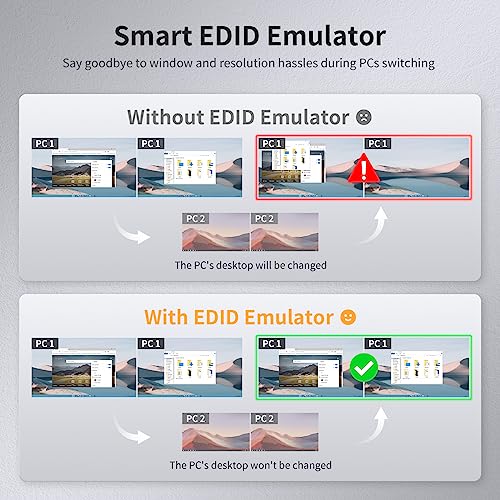 【Commutateur KVM DisplayPort 4 PC 2 moniteurs】 Commutateur KVM 4 ports pour connecter jusqu'à 4 ordinateurs de bureau ou ordinateurs portables pour partager 1 jeu de clavier, souris et 2 moniteurs pour la configuration de bureaux à domicile, consoles de jeux et appareils de streaming. Répondez aux besoins de vos différents appareils, réduisez l'encombrement et créez de l'espace sur le bureau en réduisant le nombre de claviers, moniteurs et souris indésirables, environnement de travail simplifié.