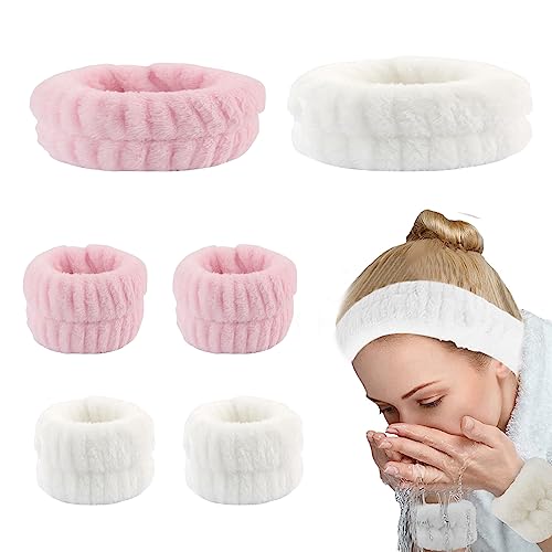 【Combinazione Perfetta】Set comprende 2 fasce per il trucco e 2 paia di braccialetti per il lavaggio del viso in bianco e rosa.