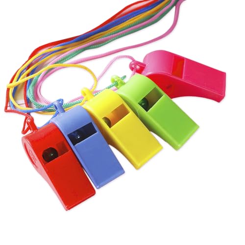 La confezione include 5 fischietti di plastica colorati con cordini (rosso, giallo, blu, verde, rosa).Scelta ideale per arbitri, allenatori, formazione, insegnanti, scuola, sport, funzionari ecc.