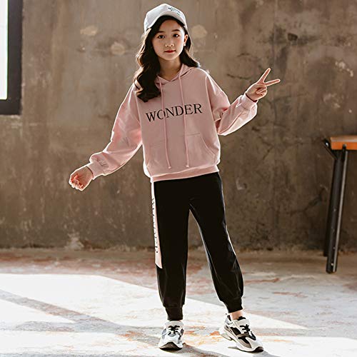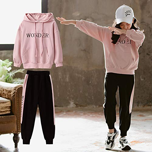 SXSHUN Ragazze Tuta da Jogging 2 Pezzi Giacca Sportiva Maglione con Cappuccio Set Coulisse Felpa con Cappuccio Tuta Sportiva Tuta Felpa Primavera Autunno, Rosa, 13-14 Anni