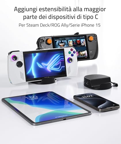 Chip più Intelligente per un'Elevata Compatibilità:Il chip intelligente superiore integrato espande la compatibilità dell'hub USB C con la maggior parte dei dispositivi di tipo C, come l'iPad, telefoni, tablet e laptop. e altre console portatili. [NOTA] NON è compatibile con la console AYA NEO.