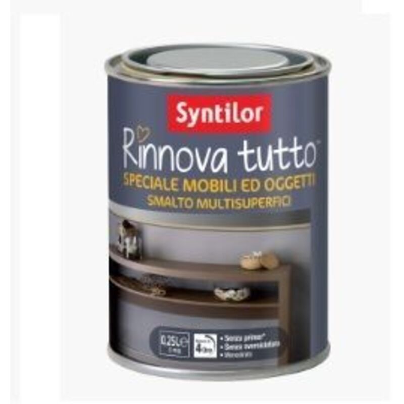 SYNTILOR - RINNOVA TUTTO SMALTO SPECIALE MOBILI 0,250 LT RAME METALLIZZATO Syntilor ha creato per voi lo Smalto Multisuperfici Rinnova Tutto. Una pennellata e i vostri mobili ritroveranno modernità e armonia. Efficace: senza sverniciatura, senza primer. Rapido: nessuna messa in opera particolare, prodotto pronto per l'uso. Semplice: nessun attrezzo specifico, applicazione facile. Punti di forza Superfici d'applicazione: Mobili in legno, melaminici o in laminato, vecchie finiture (smalto, impregnante, vernice...), oggetti nuovi o vecchi, gesso (piccoli oggetti), cartapesta, cartone . Legni particolari ;