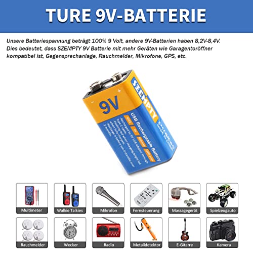 Risparmia tempo: solo 1,5 ore, possiamo caricare completamente le batterie al litio SZEMPTY 9V. 650 mAh ad alta capacità, dura molto più a lungo delle batterie NiMH. Non dobbiamo più aspettare a lungo per riutilizzare i nostri dispositivi o giocare con i giocattoli per bambini.