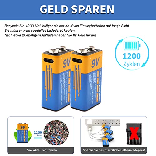 FACILE DA USARE: ricaricare queste batterie da 9 V è facile come caricare un telefono. Basta collegare un cavo USB-C (incluso) alle batterie, non è necessario alcun caricatore speciale. Possiamo caricare contemporaneamente 1/2/3/4 batterie a seconda delle necessità. È particolarmente comodo quando siamo fuori e siamo in viaggio.