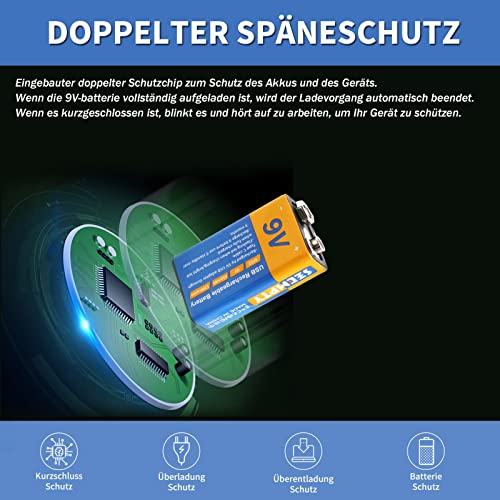 Senza preoccupazioni: quando la batteria al litio da 9 V è completamente carica, la ricarica si interrompe automaticamente. Se è in cortocircuito, non funzionerà più. Approvazione CE, FCC e RoHS.