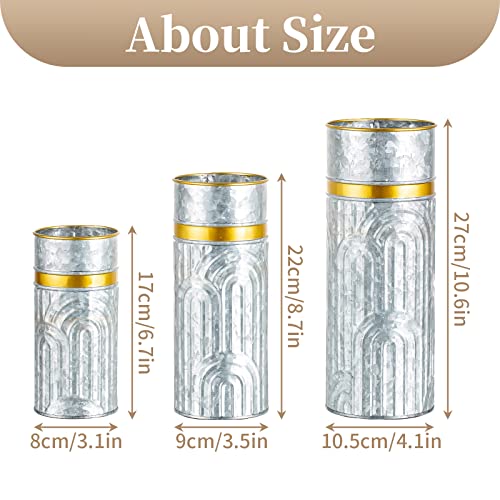 Sziqiqi Rustico Vaso Zincato, Set di 3 Vasi in Metallo da Fattoria con Bordo Dorato, Vintage Vasi per Fiori Cilindrici in Argento Vasi Decorativi Shabby Chic per Centrotavola Soggiorno Camera da Letto