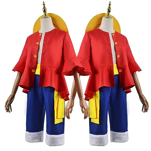 SZYDM Anime One Piece Monkey D. Luffy Vestito Cosplay con Cappello, Pantaloni per Giochi di Ruolo Top Set Completo Abiti per Feste di Natale di Halloween per Adulti Bambini,Rosso,XL